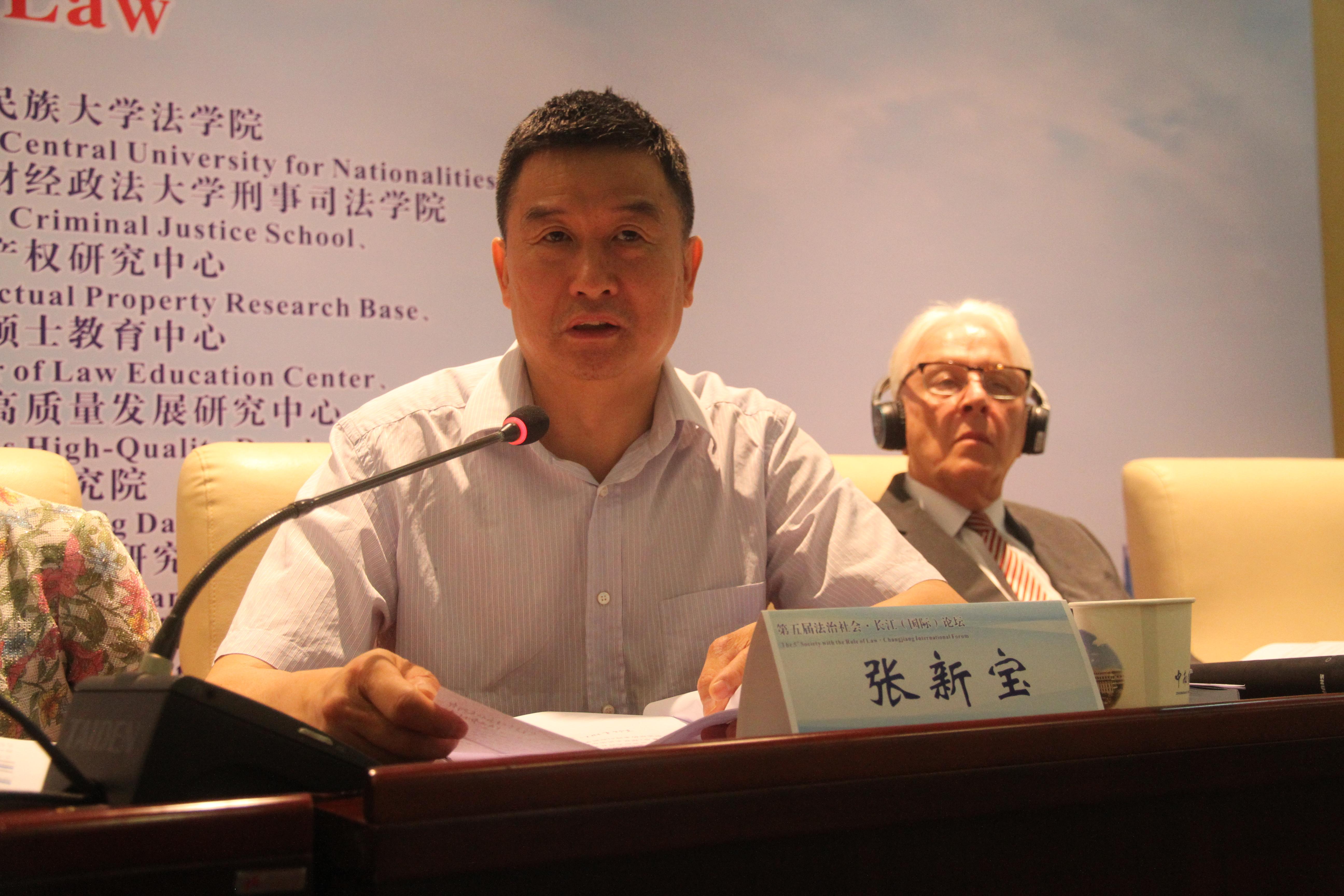 中国法学杂志社总编辑、中国人民大学法学院张新宝教授对本届论坛在形式和内容上的创新予以肯定,希望与会代表紧紧围绕习近平总书记关于构建哲学社会科学学科体系、学术体系、话语体系的讲话精神,在构建社会治理法学-三大体系-上下功夫,达到夯实理论基础的效果。