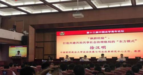 中南财经政法大学法治发展与司法改革研究中心主任、湖北法治发展战略研究院院长徐汉明教授作题为《“枫桥经验”:打造共建共治共享社会治理格局的“东方模式”》的主旨演讲。首先,徐汉明教授指出,这次论坛以“枫桥经验与基层治理现代化”为主题,非常契合党的十九大关于推进以基层治理体系建设为重点的“四个体系”建设,打造共建共治共享社会治理格局的战略部署精神。随后,在对枫桥经验系统梳理总结的基础上,阐释了作为跨越三个时期的“枫桥经验”,其蕴含着丰富的 “共建共治共享”元素,已由60年代的经验、改革开放时期的典型,发展成为新时代推进社会治理现代化的样板。它不仅具有引领当代中国推进基层社会治理体系和治理现代化的普遍意义,而且为那些既希望加快自身发展,顺利跨越“中等收入陷阱”,又希望保持民族独立性,实现自身社会和谐稳定的大多数发展中国家提供“中国智慧”,展示“枫桥经验”作为“东方模式”的魅力。其次,徐汉明教授阐述了枫桥经验的核心要义及其时代价值。作为打造共建共治共享社会治理格局的“东方模式”,“枫桥经验”的核心要义可概括为:(1)坚持解放思想、实事求是的思想路线。(2)坚持人民主体地位,贯彻专门机关与群众相结合的路线。(3)坚持以人为本的理念,实现人的全面发展。(4)坚持与时俱进,创新基层社会治理新模式。(5)坚持发挥政治优势,筑牢社会和谐稳定新防线。作为地方良政善治的经典样本,“枫桥经验”时代价值表现在4个层面:(1)理论价值层面;(2)制度价值层面;(3)文化价值层面;(4)实践价值层面。最后,徐汉明教授在报告中揭示了“枫桥经验”给打造共建共治共享社会治理格局带来的启示,即:更加注重联动融合,增强治理活力;更加注重开放共治,打造共建共治共享社会治理共同体;坚持以人民为中心,让改革发展成果更多更公平惠及全体人民;更加注重运用法治方式,提高社会治理法治化水平;更加注重运用大数据、提高社会治理智能化水平;更加注重基础性制度建设,为社会治理长远发展奠基。