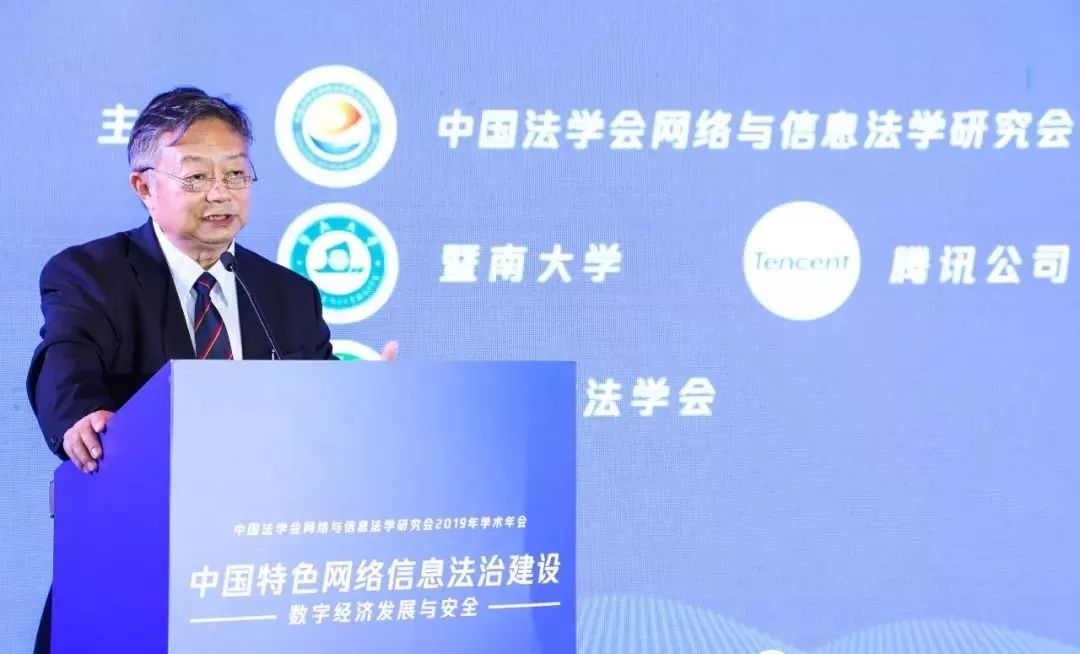 会议第二阶段为主旨演讲环节,由中国法学会网络与信息法学研究会副会长、中国政法大学教授王卫国担任主持。中央网信办政策法规局副局长刘少文,中国法学会网络与信息法学研究会副会长、公安部十一局政委赵世强,中国法学会网络与信息法学研究会副会长、中国人民大学法学院教授姚辉,中国法学会网络与信息法学研究会常务理事、广东省法学会网络与电子商务法学研究会长、暨南大学法学院副院长、教授刘颖,微众银行首席人工智能官杨强,腾讯云副总裁王龙分别作主旨演讲。