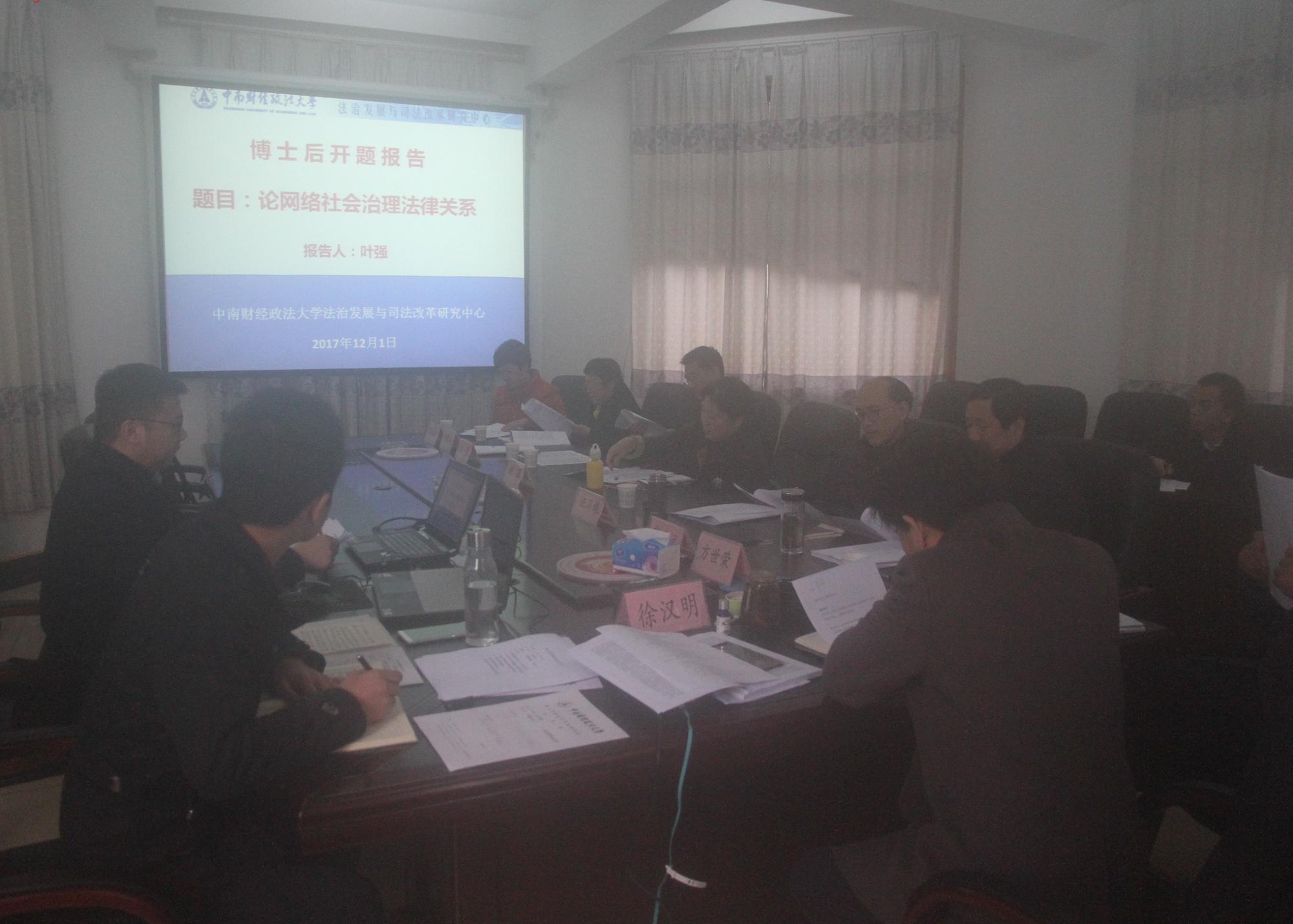 2017年12月1日下午,在中南财经政法大学法治与司法改革研究中心二楼会议室举行了社会治理法学博士后叶强开题报告评审会。参加本次开题考核评审的专家有:武汉大学法学院汪习根教授、皮勇教授;中南财经政法大学齐文远教授、姚莉教授、方世荣教授、黎江虹教授、赵丽江教授以及博士后合作导师徐汉明教授。本次评审会由武汉大学法学院汪习根教授主持。