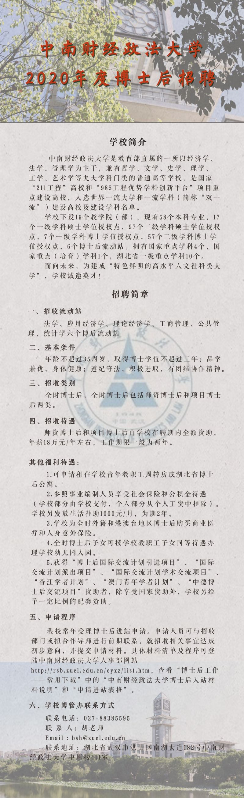 中南财经政法大学2020年博士后招聘