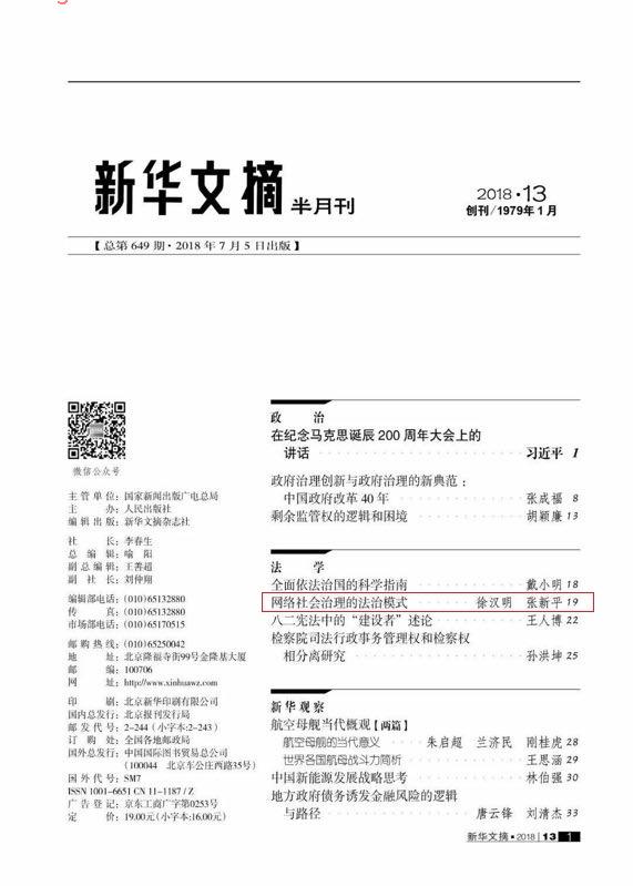 近日,徐汉明教授和张新平博士的研究成果《网络社会治理的法治模式》被《新华文摘》2018年第13期全文转载。此前该论文刊登于《中国社会科学》2018年第2期。