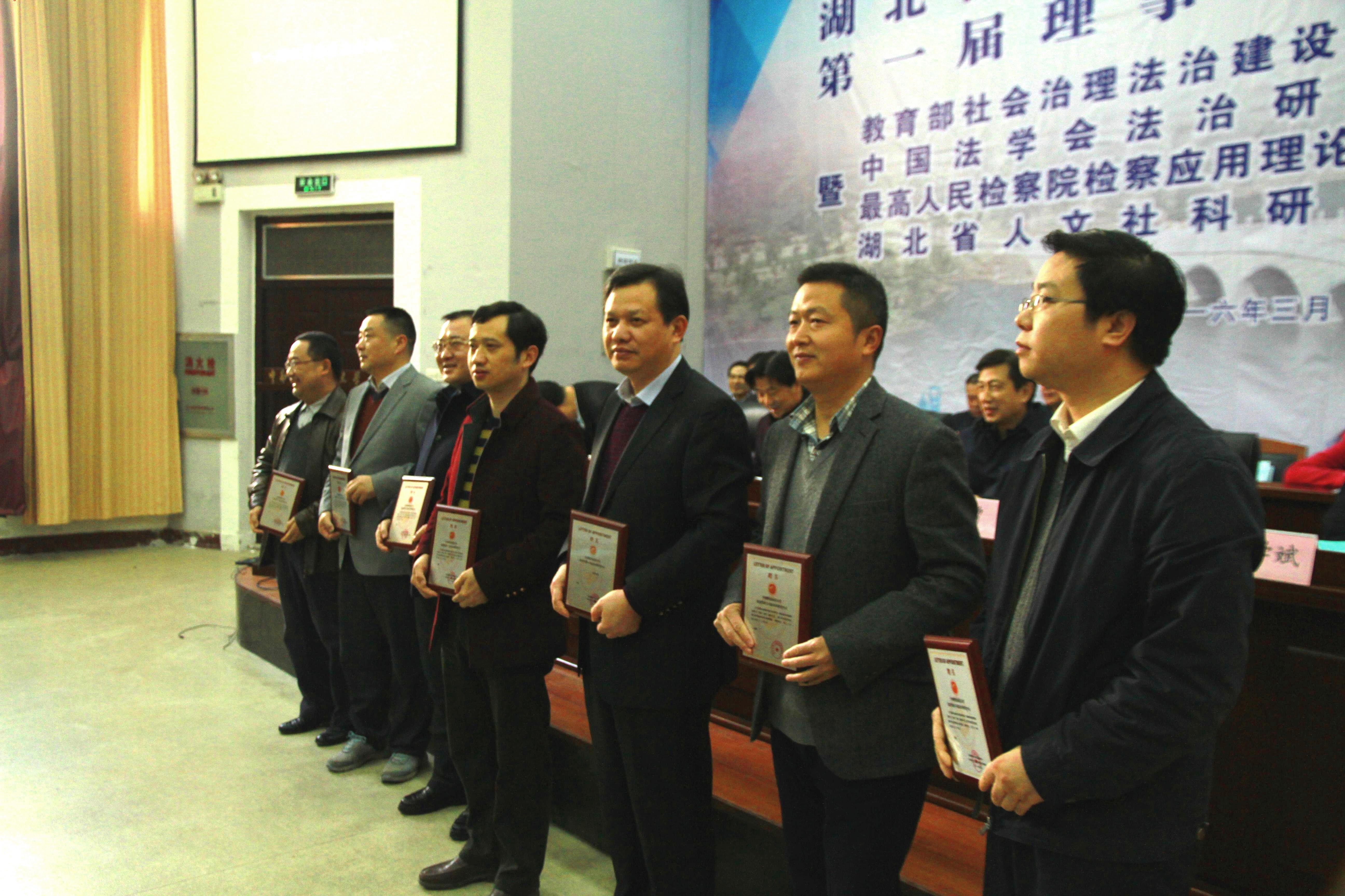 全国哲学社会科学规划领导小组副组长、湖北省人大常委会副主任尹汉宁同志、湖北省人大常委会副秘书长胡金国、湖北省法学会党组书记、常务副会长万学斌同志、湖北省法学会副会长、湖北法治发展战略研究院副理事长姚仁安、中南财经政法大学教育发展基金会理事长、“研究基地”顾问徐敦楷等领导学者出席会议并对新增选的智库专家授牌。