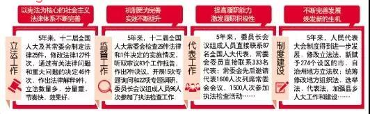 报告显示,5年来,全国人大常委会认真贯彻中央决策部署,坚持问题导向,更新立法理念,完善制度措施,解决突出问题,回应群众关切,着力加强重点领域立法,科学立法、民主立法、依法立法取得新进展,各项重点领域立法稳步推进,经济、政治、文化、社会、生态领域一批重大立法相继出台。