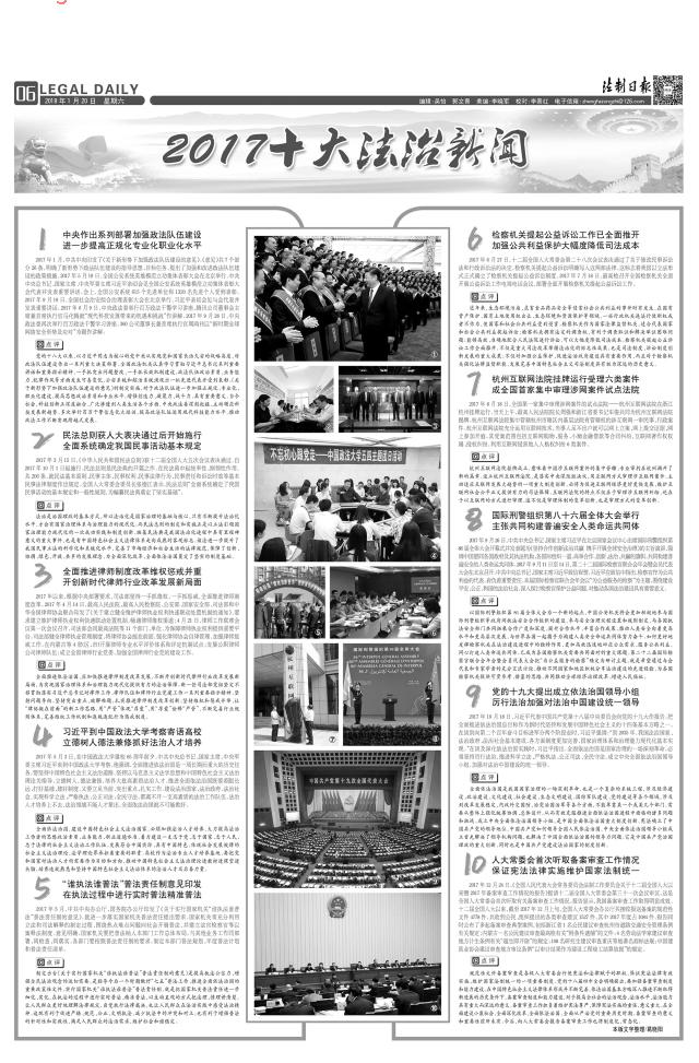 由法制日报社主办,以-梳理年度法治新闻,推动中国法治进程-为宗旨的《法制日报》2017年度十大法治新闻评选结果于1月19日揭晓。经初评委员会推荐、终评委员会定评等程序,-中央作出系列部署加强政法队伍建设 进一步提高正规化专业化职业化水平-等入选十大法治新闻。