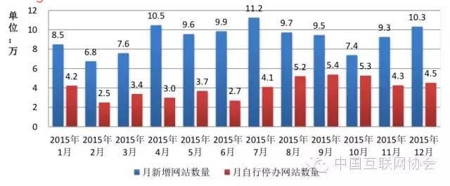 十一、中国互联网行业创新创业更加活跃与频繁。互联网领域的创业创新正在引领新一轮科技革命和产业变革,互联网领域呈现出前所未有的创业创新热情和氛围。从2015年“中国互联网企业100强”排行榜来看,在前十位中有三家企业发生变化,阿里巴巴跃升第一,携程、搜房首次跻身前十。创业创新是否成功与网站生存周期关系密切,2015年全年新开通的中国网站数量110.3万余个,平均每月新开通网站9.1万余个;全年网站主办者自行停办的中国网站48.3万余个,平均每月自行停办的网站4万余个。2015年网站主办者新开通及自行停办的中国网站数量月变化情况见图1-7。