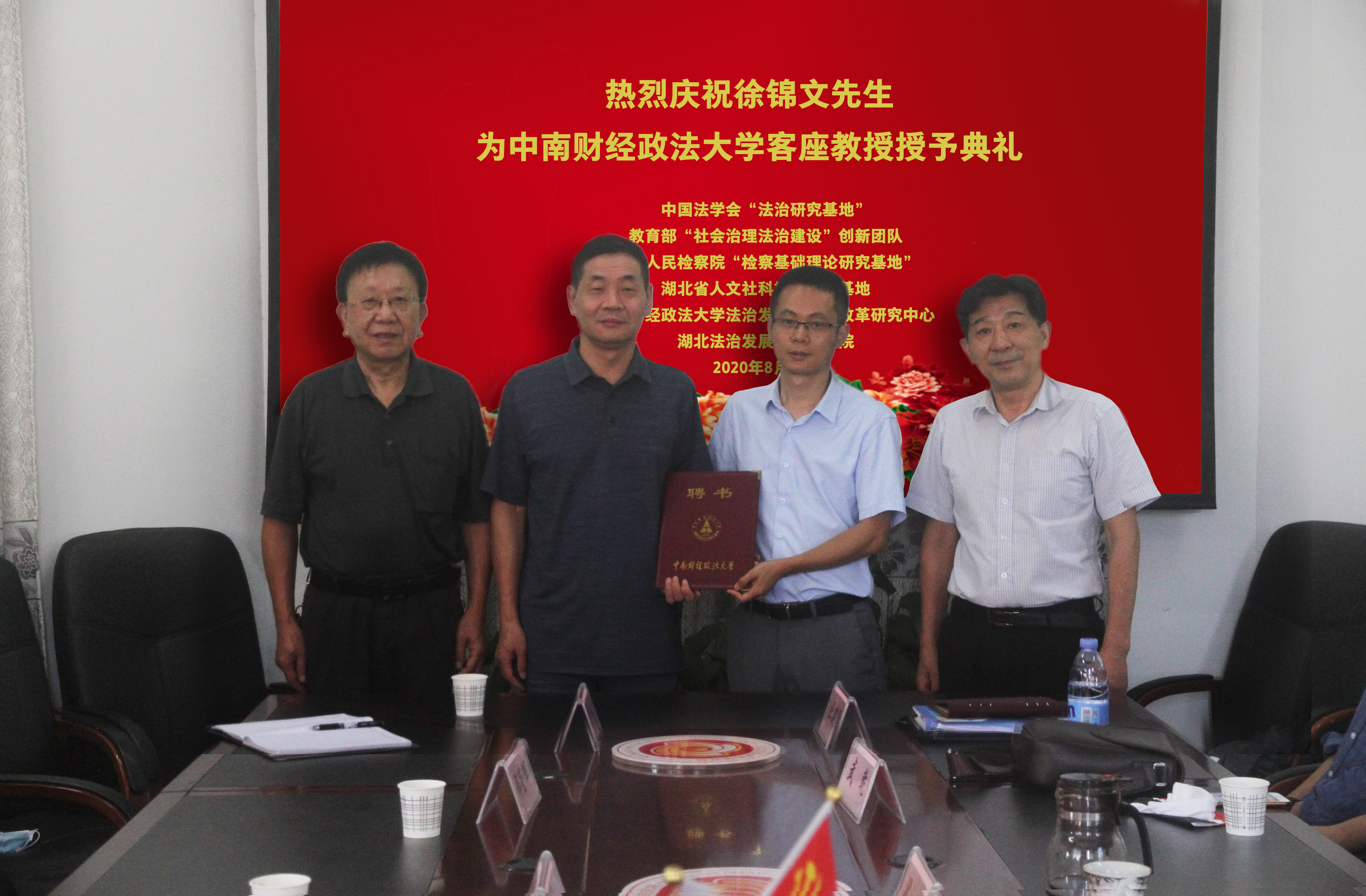 (通讯员 方雅)日前,经中南财经政法大学校长杨灿明签批,聘任香港知名证券经理人徐锦文先生为中南财经政法大学客座教授。学校人才办主任、青年学者、特聘专家陈柏峰教授,教育部社会治理法治建设创新团队学术带头人暨中国法学会法治研究基地主任徐汉明教授分别代表校领导与智库基地向徐锦文先生颁发聘任客座教授证书。