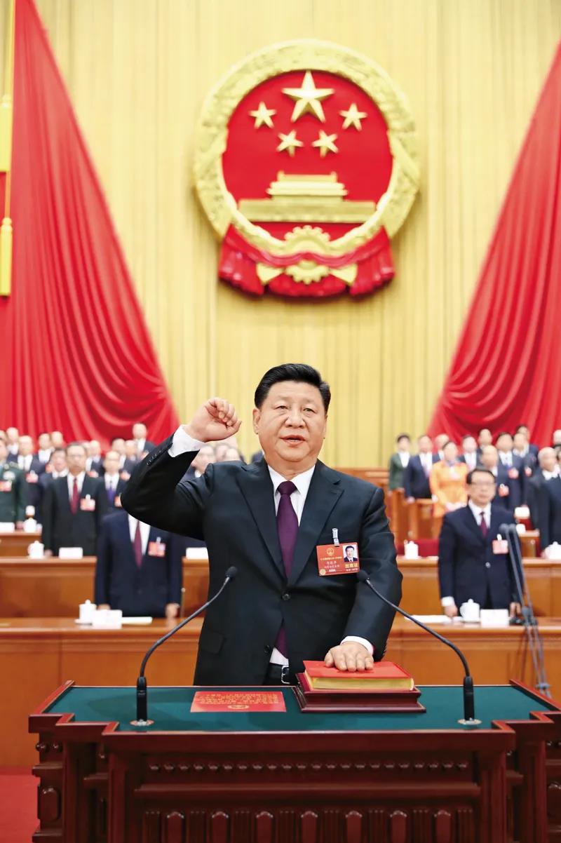2018年3月17日,十三届全国人大一次会议在北京人民大会堂举行第五次全体会议。习近平当选中华人民共和国主席、中华人民共和国中央军事委员会主席。这是习近平进行宪法宣誓。 新华社记者 鞠鹏/摄