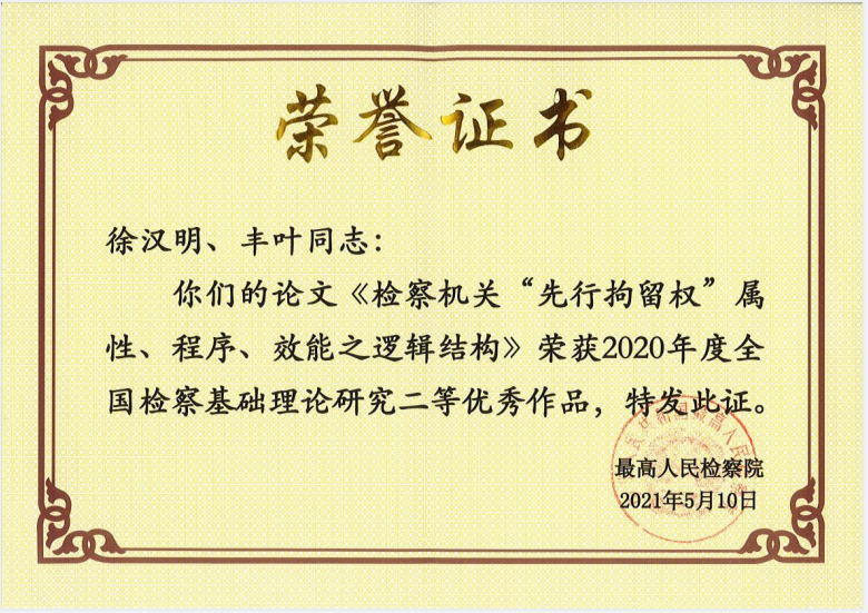 中南财经政法大学法治发展与司法改革研究中心主任暨湖北法治发展战略研究院院长徐汉明教授,中南财经政法政法大学诉讼法博士研究生丰叶撰写的《检察机关“先行拘留权”属性、程序、效能之逻辑结构》荣获2020年度全国检察基础理论研究二等优秀作品。