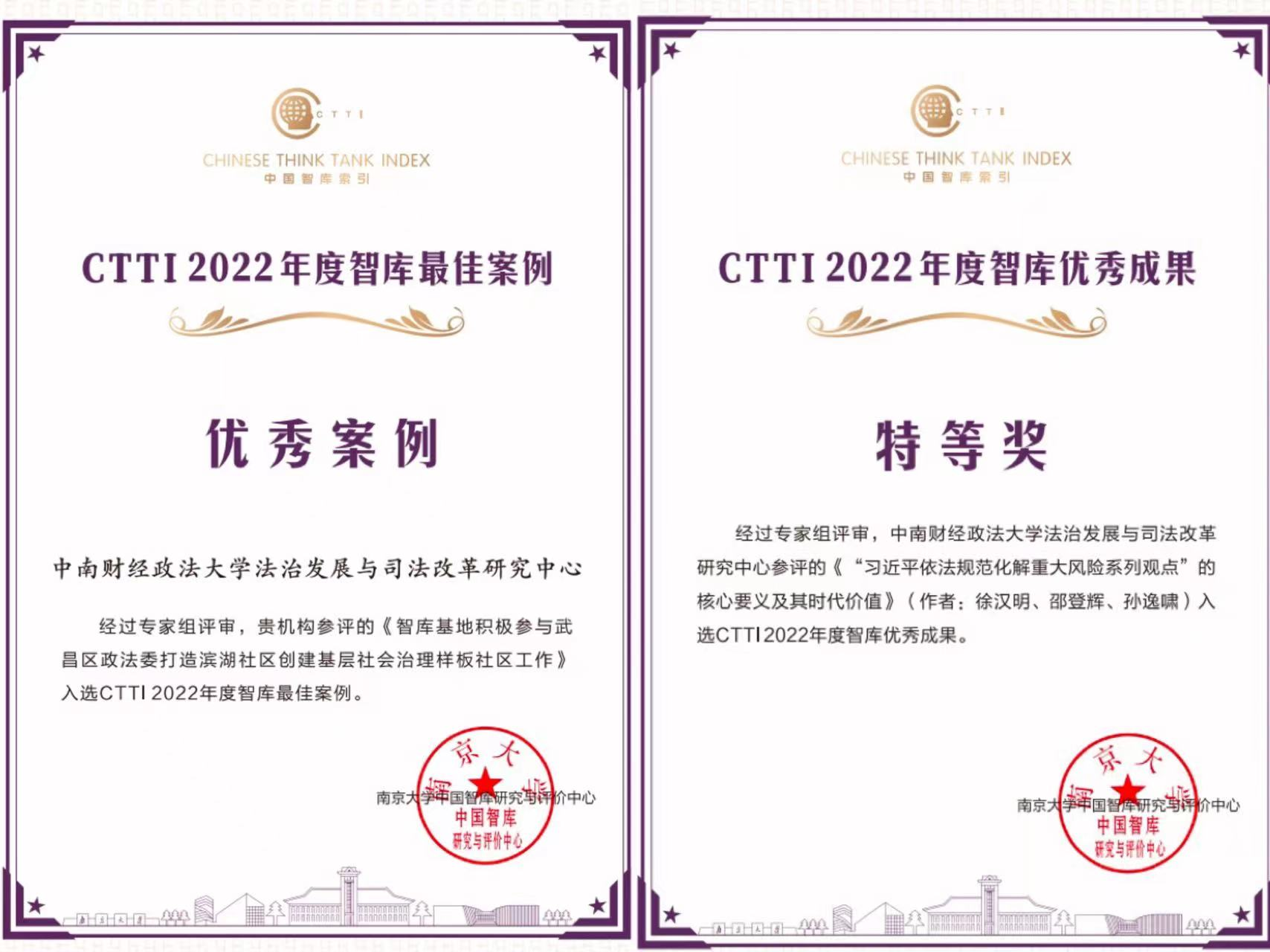 中南财经政法大学法治发展与司法改革研究中心《智库基地积极参与武昌区政法委打造滨湖社区创建基层社会治理样板社区工作》荣获“优秀案例”、中南财经政法大学法治发展与司法改革研究中心徐汉明教授,邵登辉、孙逸啸讲师撰写的《“习近平依法规范化解重大风险系列观点”的核心要义及其时代价值》荣获“优秀成果特等奖”。